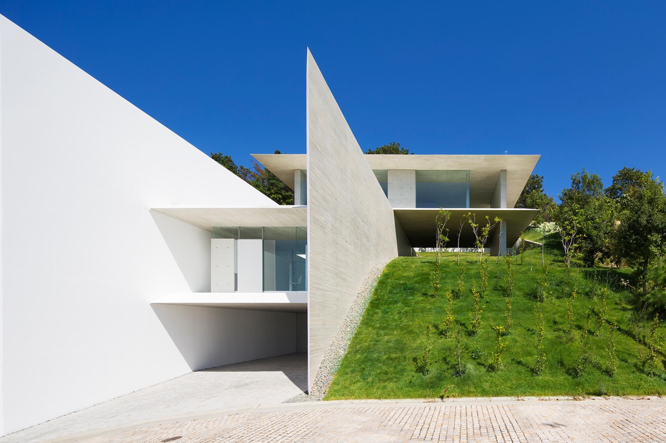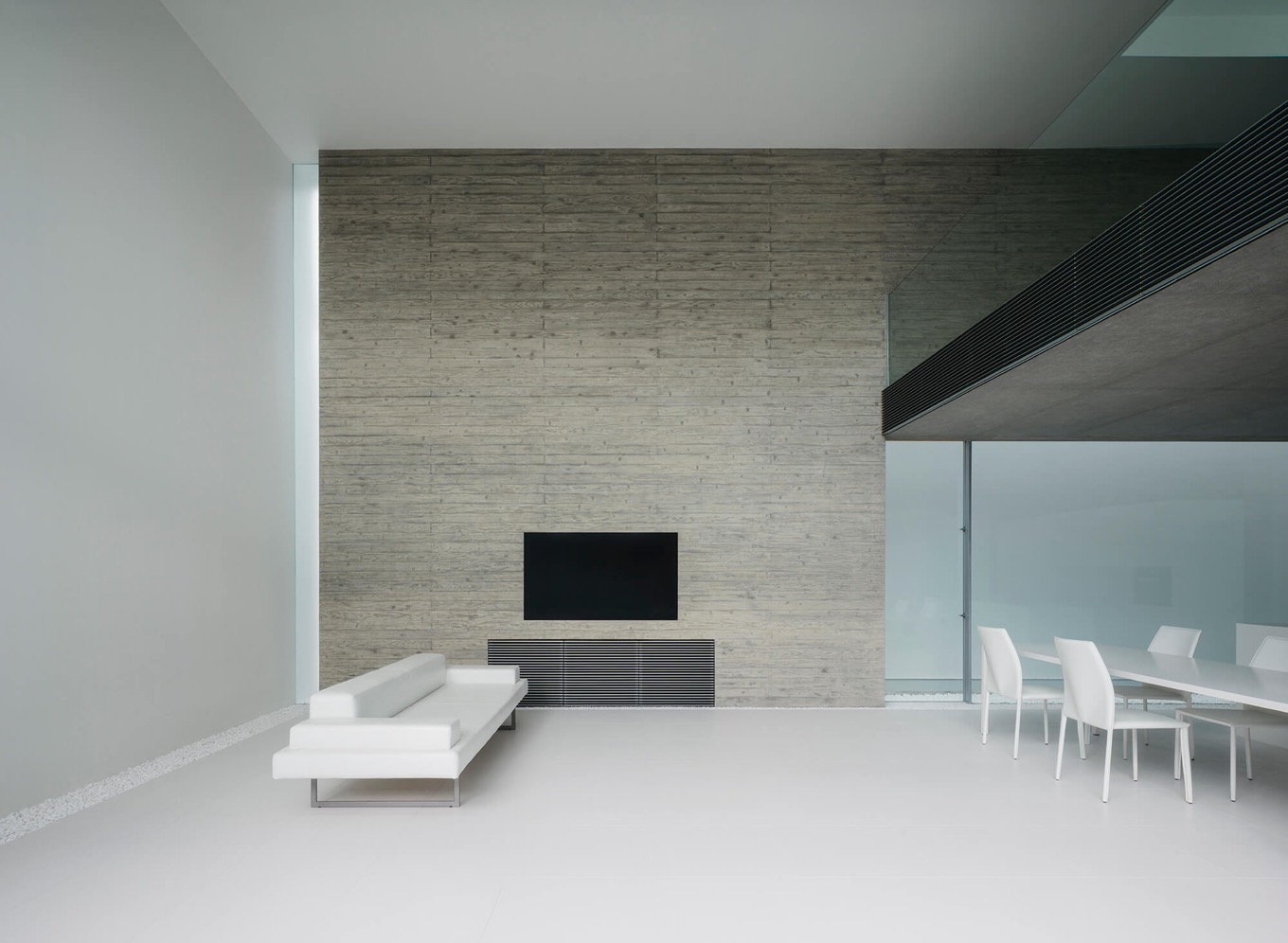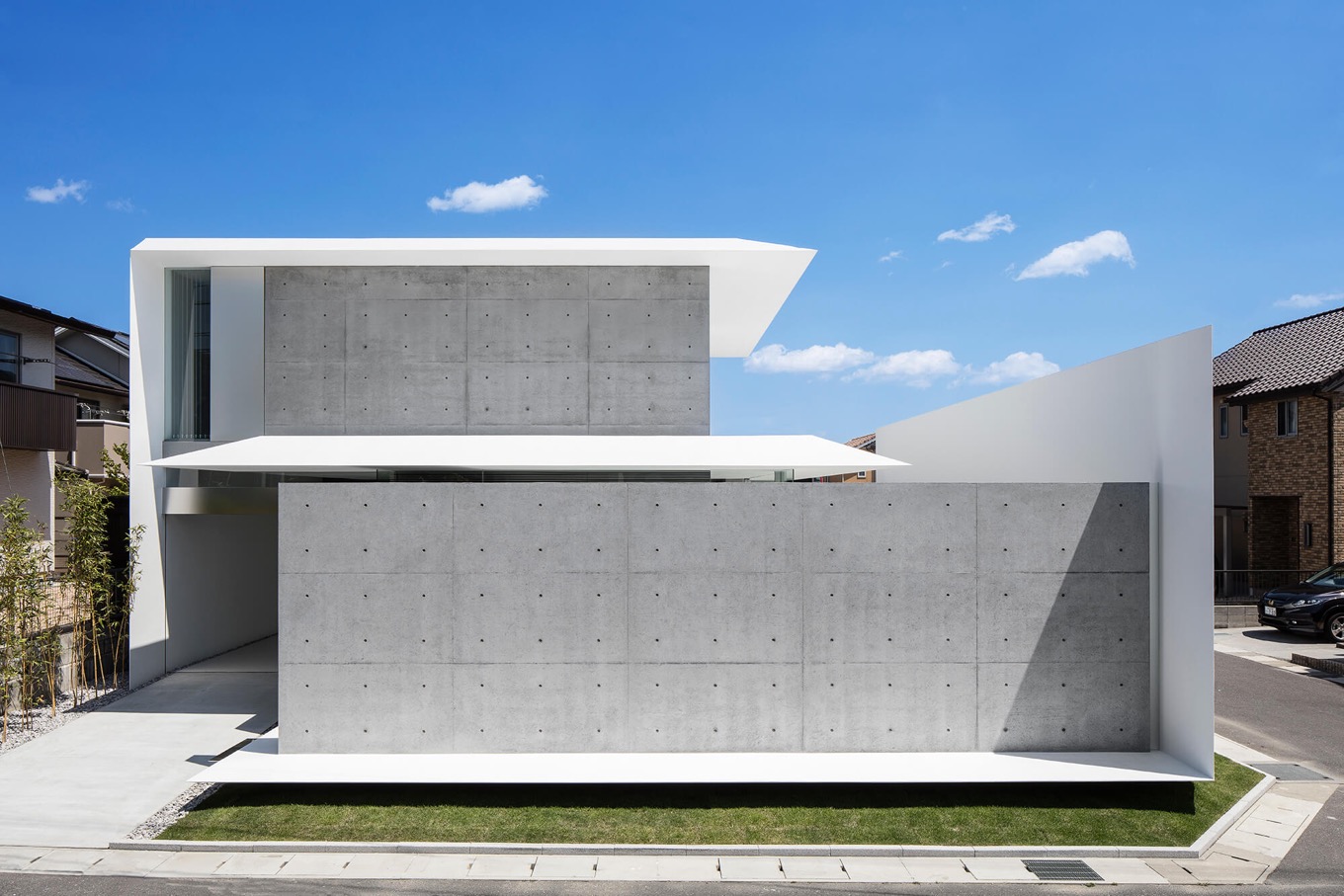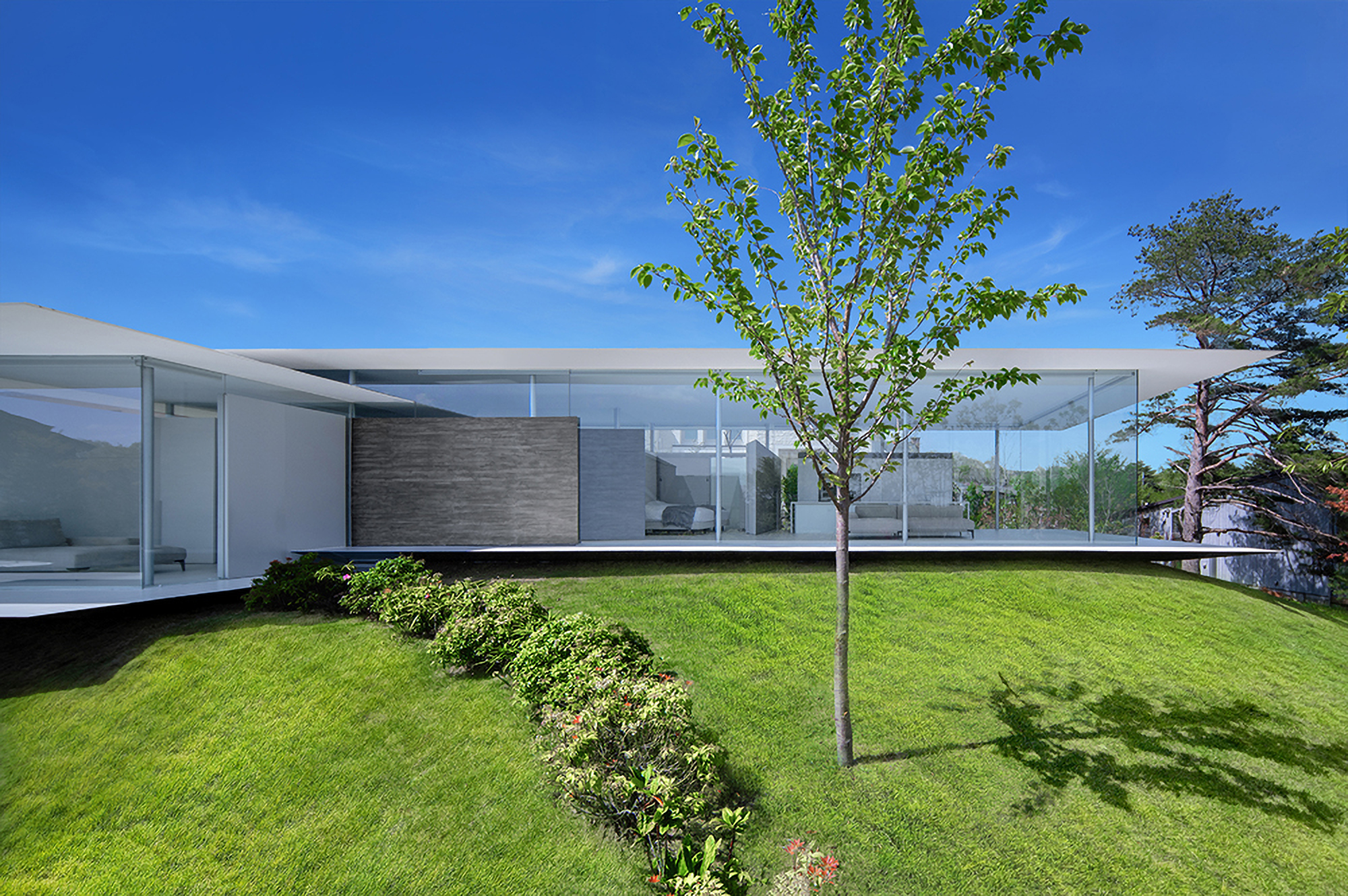 建物は、2枚のコンクリートの壁を直交させて地面に差し込み、2枚のコンクリートの屋根を平行に浮かせたデザインとなっています。
