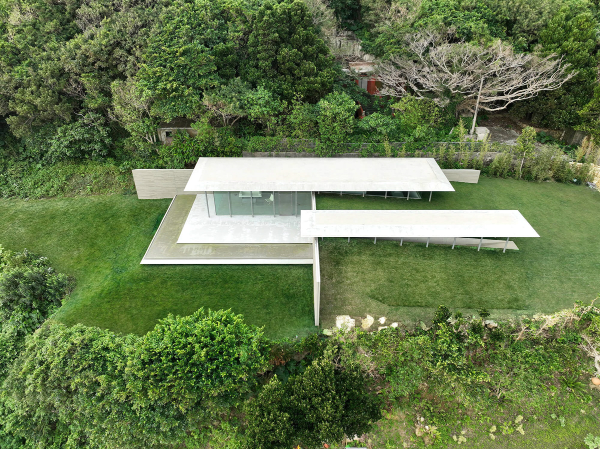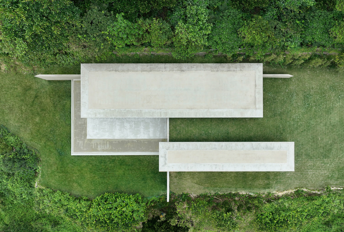 建物は、2枚のコンクリートの壁を直交させて地面に差し込み、2枚のコンクリートの屋根を平行に浮かせたデザインとなっています。